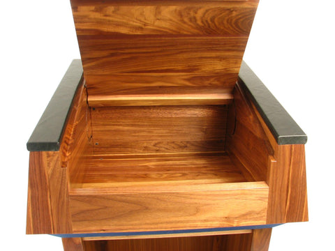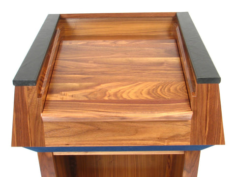This is a phenomenal podium with all of the bells and whistles. Many compound angles provide its stately appearance and will add to any presentation. Some of the highlight features that come standard include: Choice of Walnut, or Cherry (shown in Walnut). Top is fabric covered with choice of navy-blue, red, or black. Hand rails are leather covered. Top contains drop-down surface which easily drops from angled to flat for laptop computer use. Top surface lifts for access to materials inside. Base contains casters which allow for easy maneuverability. Column contains shelf for storage. Optional laser engraved seal also available.